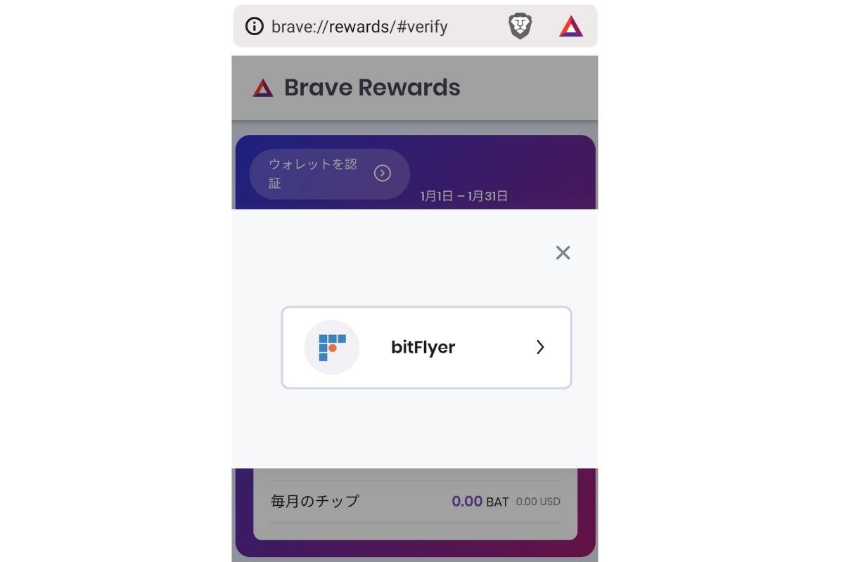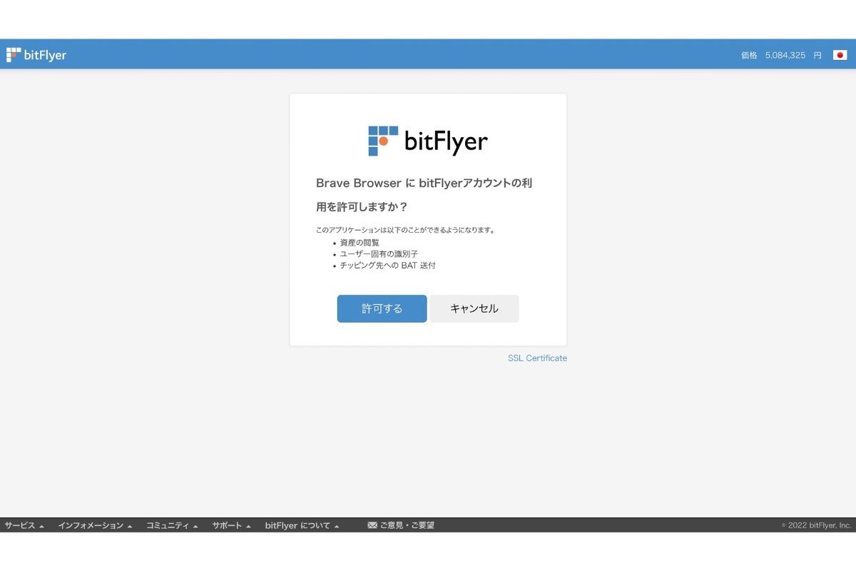 「bitFlyer」をタップすると、 birFlyerのログイン画面が表示されます。ログインし、Braveのリクエストを許可します。