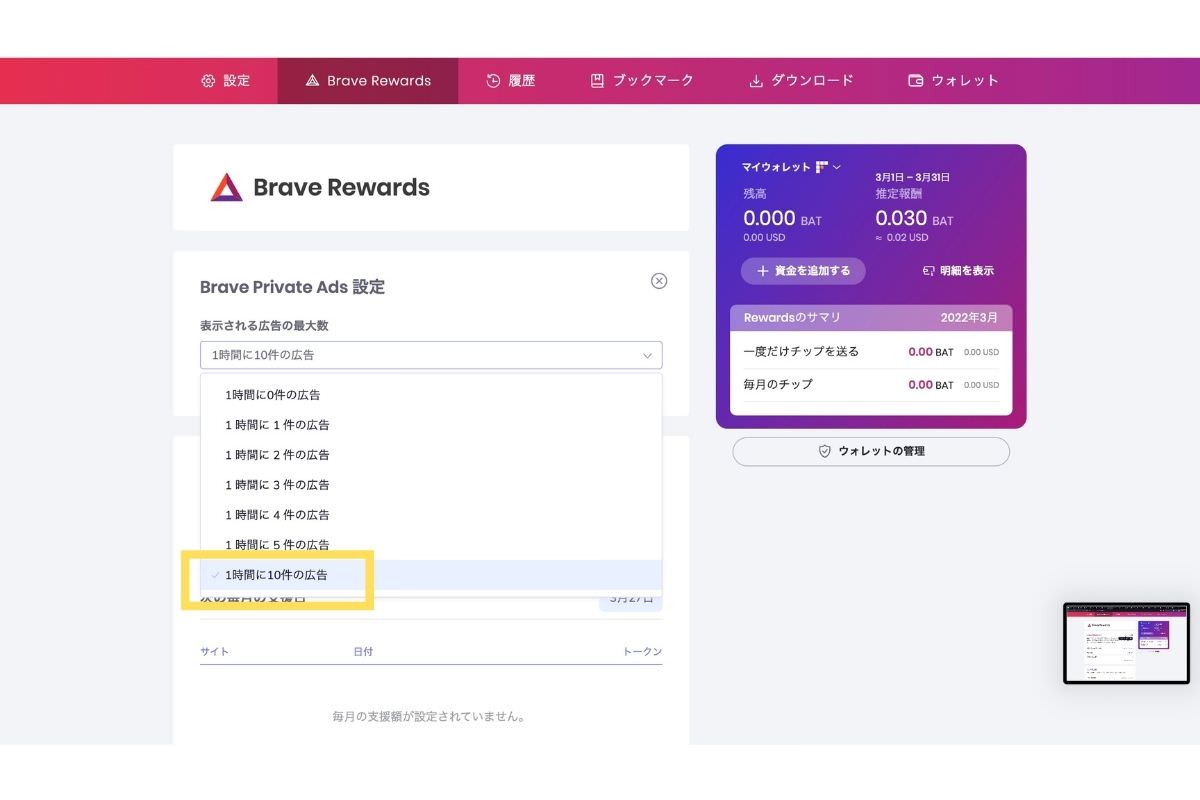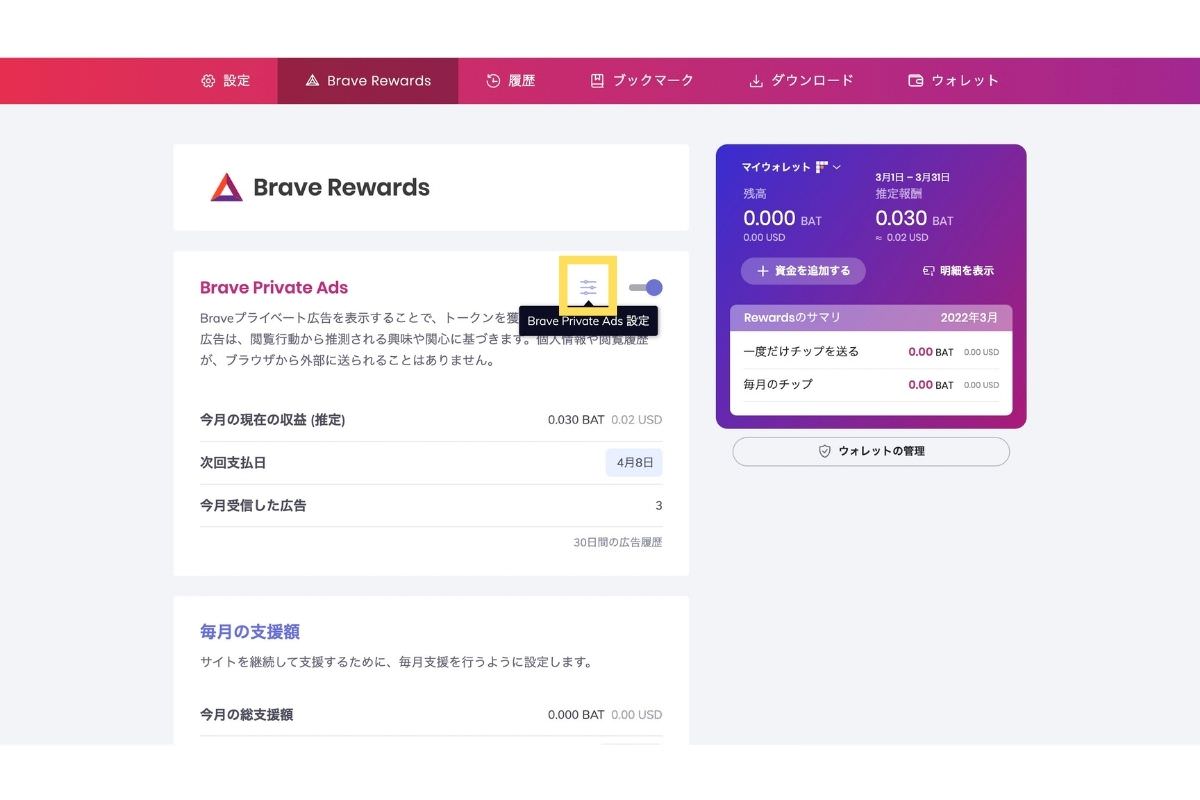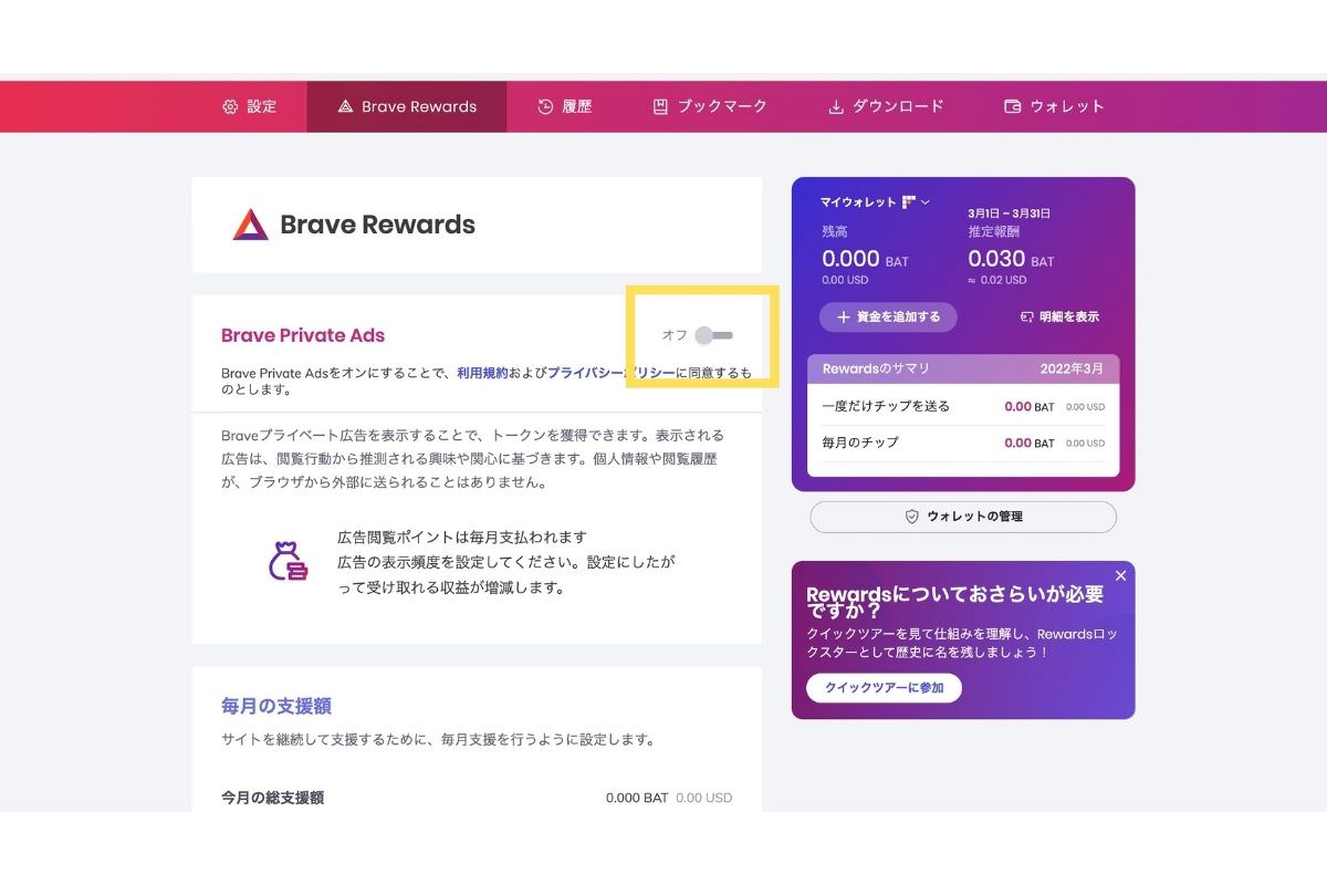 Brave Rewardは、「広告を表示するかどうか」の設定で、オフにすると広告が表示されなくなります。報酬ゲットのため、必ず「オン」にしましょう。