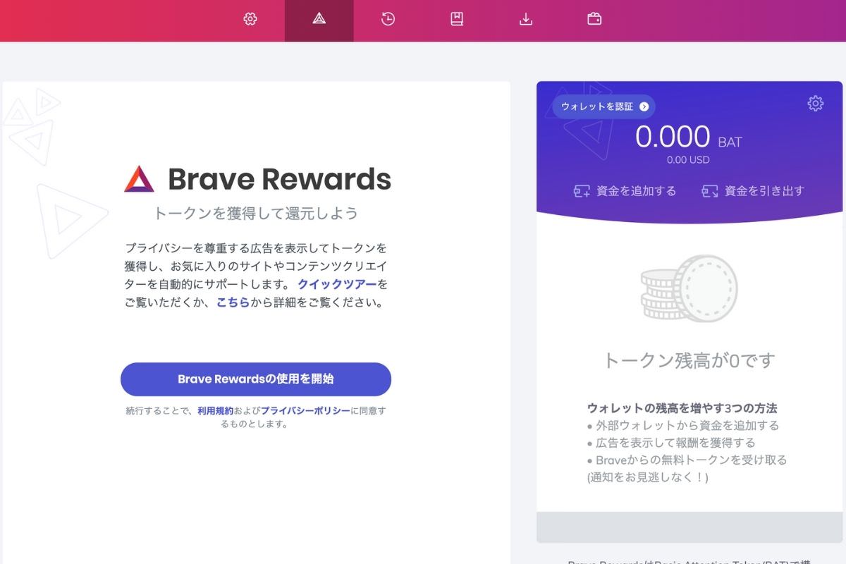 Brave Rewardsの使用を開始していない方は、「Brave Rewardsの使用を開始」をクリックします。