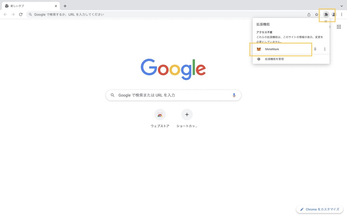 Chrome画面の右上にパズルピースのアイコンをクリックします。アイコンを押すとキツネが出てくるので、クリックします。
