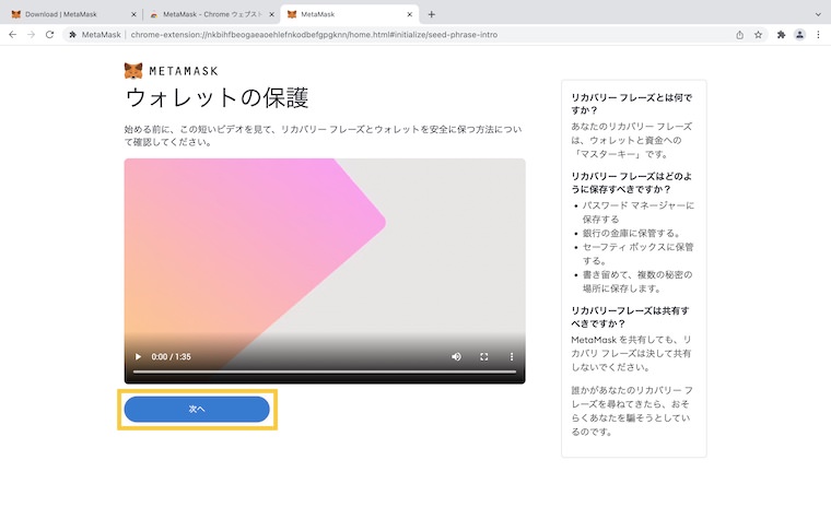 鍵マークを押すと、シードフレーズが表示されます。スクショorメモしておきます。「次へ」をクリックします。※シードフレーズは忘れないよう注意!