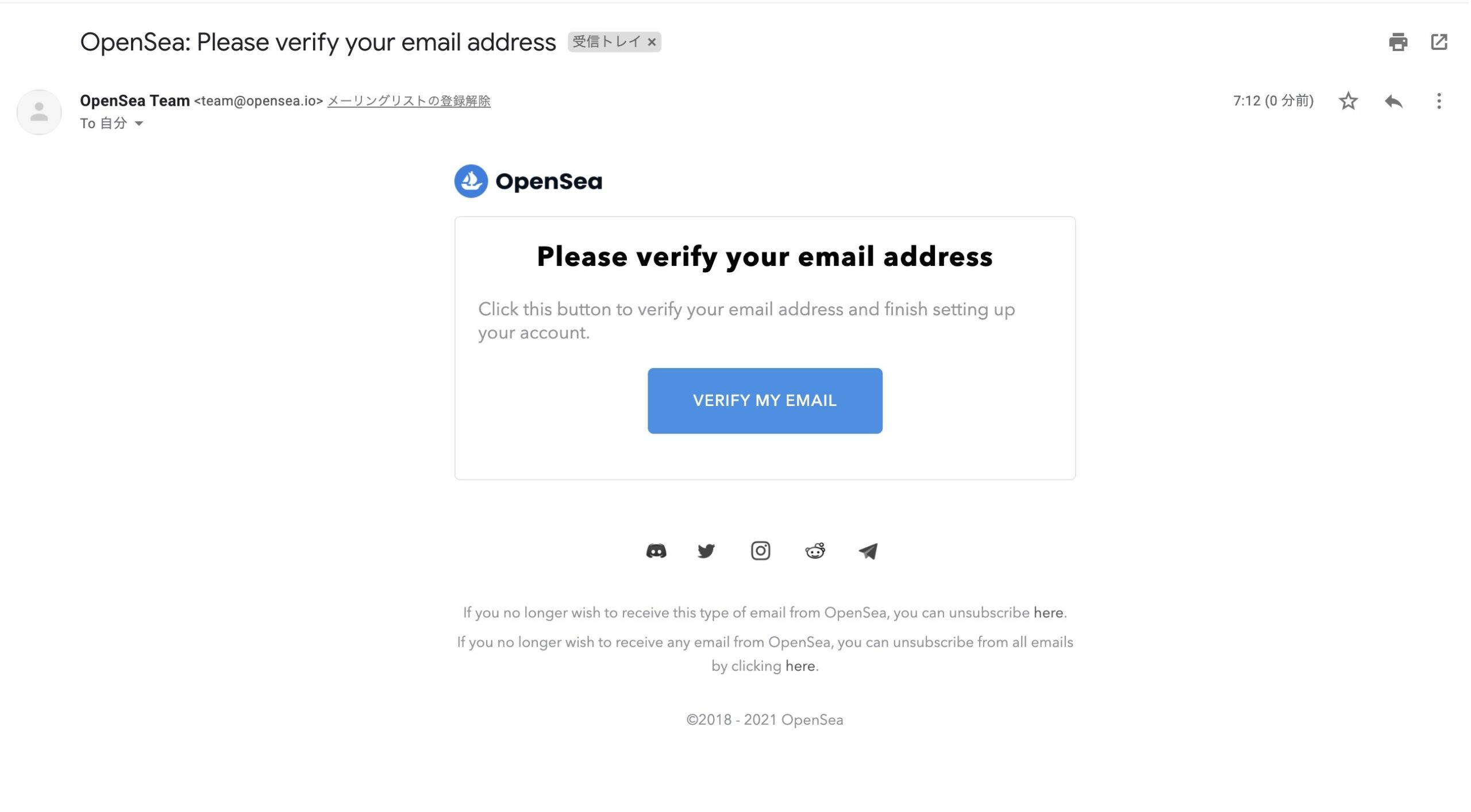 OpenSeaから、上記のようなメールが送られてきます。「VERIFY MY EMAIL」をクリックします。