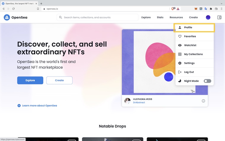 OpenSeaトップページの「Profile」をクリックします。